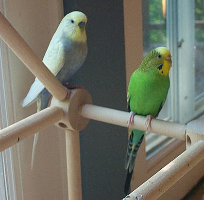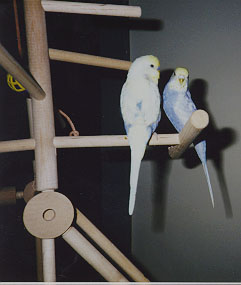 Nick and Keet are budgies (commonly called parakeets in petstores in the USA.) Keet is a fiesty little hen and came to me from a chain petstore in December, 1996 at 3-6 months of age. She is one of the smaller American/pet budgies. She is a "normal green" budgie, but, truth be told, I think normal green budgies are one of the most beautiful budgie colors.